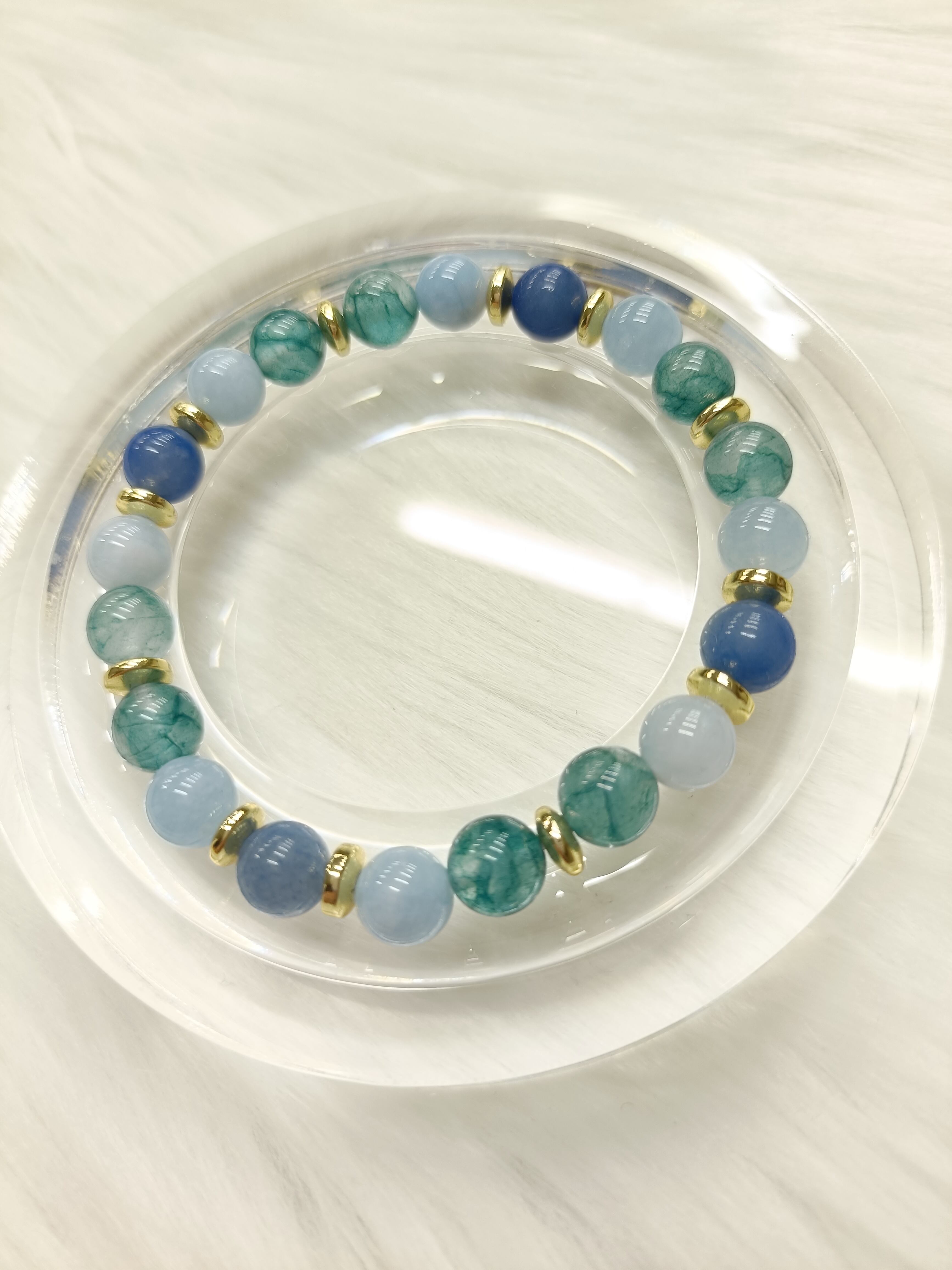 穏やかなブルーとゴールドの輝きが印象的な、心と体のバランスを整えるブレスレットです。